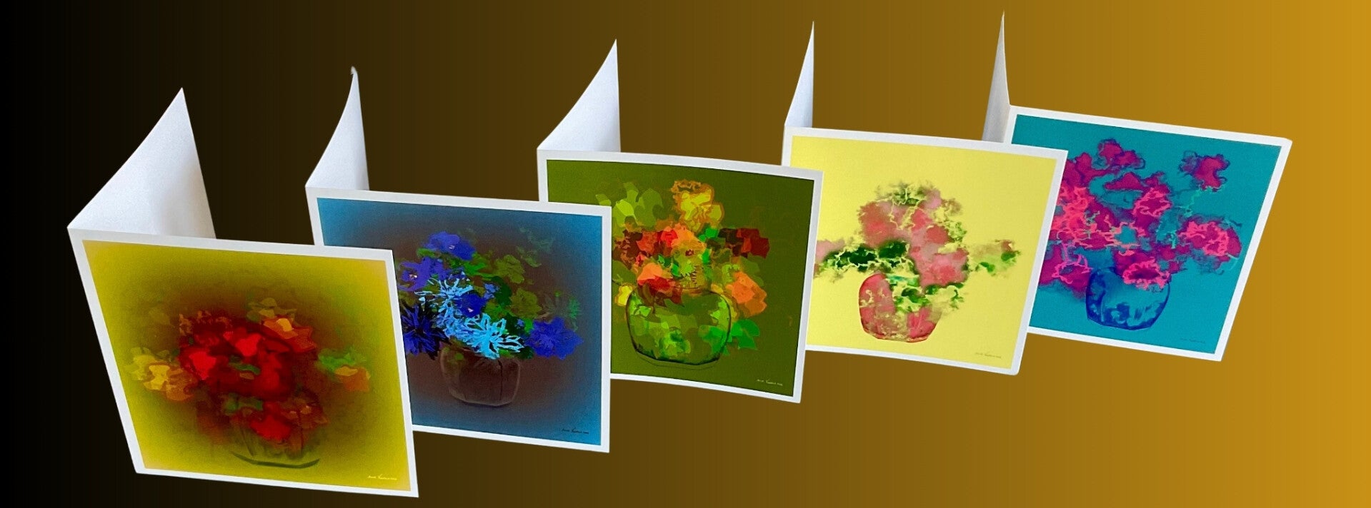 Deze 'bloemstillevens met gemberpot' zijn digitaal getekend en geschilderd. Ik heb ze professioneel laten drukken als gevouwen kunstkaarten van 14x14cm.
